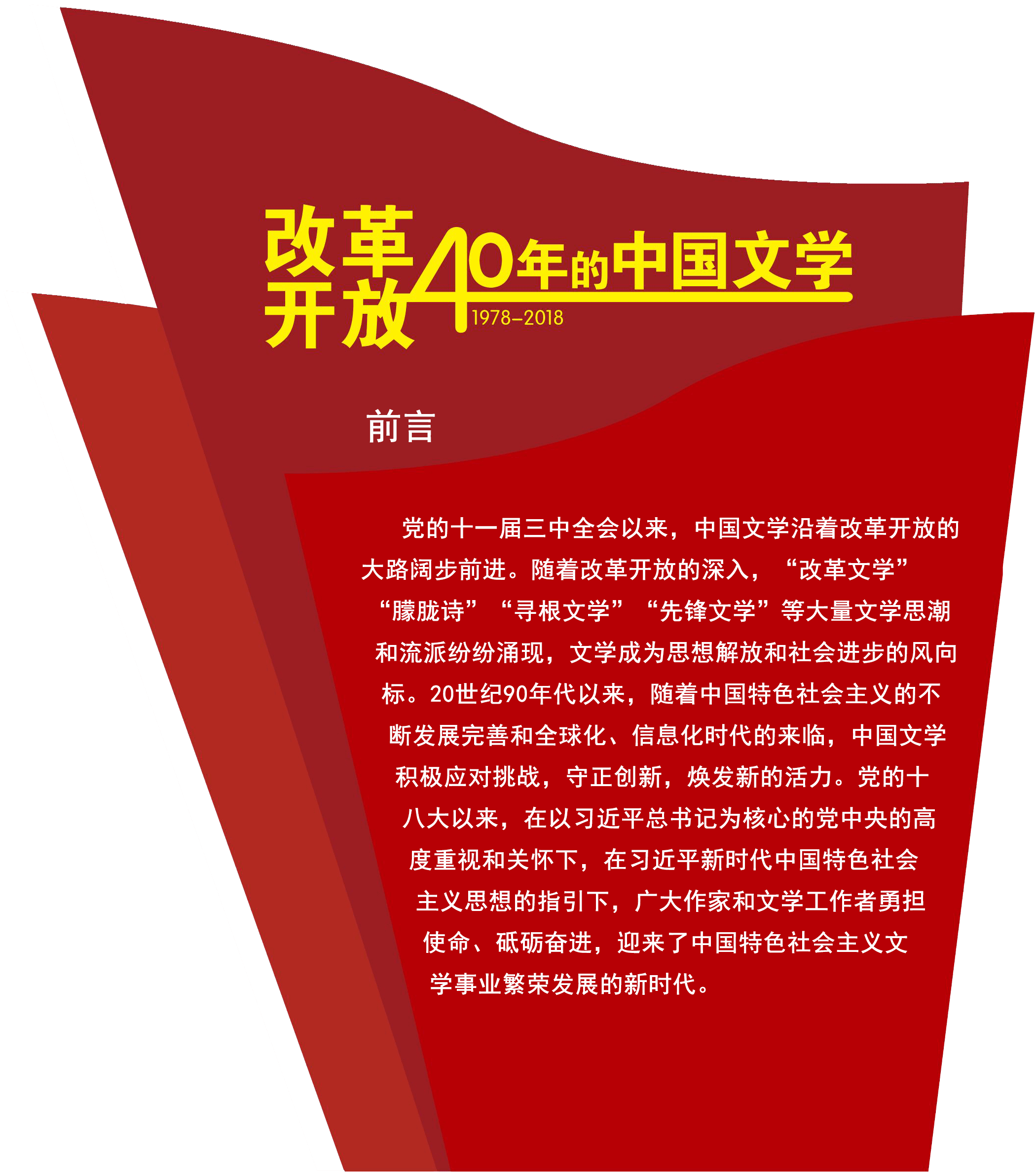 改革開(kāi)放40年,是當(dāng)代文學(xué)加快自我更新和發(fā)展腳步的40年。中國(guó)作家置身全球化背景和現(xiàn)代化進(jìn)程,在外來(lái)文藝思潮此起彼伏、文學(xué)觀念不斷更迭中大膽“拿來(lái)”,勇于探索,在不斷創(chuàng)新、汲取營(yíng)養(yǎng)中又能夠始終立足本土站穩(wěn)腳跟……