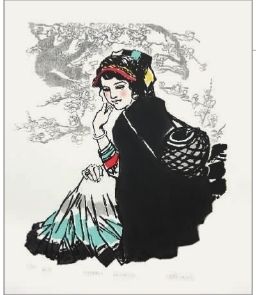 阿鴿曾說(shuō),她發(fā)現(xiàn)彝族女孩都有特別飄逸的感覺,尤其是穿著百褶裙。為了記錄下彝族女孩這種特有的美,她畫了很多稿子,去掉了繁雜的明暗關(guān)系,以明快的線條塑造了一個(gè)個(gè)含苞欲放的彝族姑娘,她們或并肩同行、或竊竊私語(yǔ)、或眺望遠(yuǎn)方,嫻靜而文雅。畫中的彝族姑娘多是穿著紅、黃、黑三種顏色的衣裙,系著民族圖案的頭帕,俏皮地斜披在頭上,粗大的發(fā)辮散發(fā)著青春的活力,現(xiàn)代的頭巾把面龐團(tuán)團(tuán)圍住,充分表現(xiàn)出現(xiàn)代彝族姑娘的審美趣味。阿鴿認(rèn)為這三種顏色是代表彝族的顏色,彝族婦女的服飾、餐具基本上都是這幾個(gè)顏色,她把彝族的色彩,裝飾性的線條及西方現(xiàn)代繪畫中的色塊分割,融入版畫的世界里,以黑、紅、黃為基調(diào)反映出彝族特有的審美趣味。