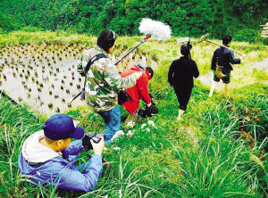 攝制組跟隨少數(shù)民族群眾拍攝他們的勞作過(guò)程。