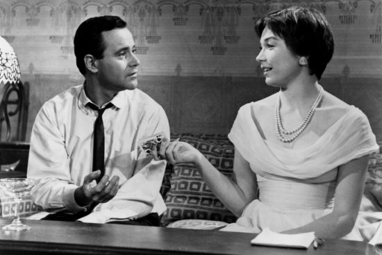這是棋子和玩物、被侮辱與被損害者的愛情。然而,比起《熱情如火》,這兩個(gè)角色顯然得到了更多的真情實(shí)感。庫(kù)布里克的“簽名”是浴室,每部電影 里都有一幕發(fā)生在浴室,而懷爾德的“簽名”是“牌桌”,幾乎每部電影都有人在打牌。懷爾德認(rèn)為,他最早受到的人性教育是在臺(tái)球室,在那兒他看慣了賭局, “關(guān)于人性我學(xué)到了很多,沒有一樣是值得贊許的”。這樣認(rèn)識(shí)這個(gè)世界的他,難怪會(huì)執(zhí)著地喜歡以騙局構(gòu)筑故事?!度章浯蟮馈防锿媾频氖恰跋炏瘛眰?,《熱情如 火》里則是黑幫,而《桃色公寓》以一個(gè)玩牌的場(chǎng)景結(jié)束。那是只屬于巴克斯特和弗蘭兩個(gè)人的牌局。