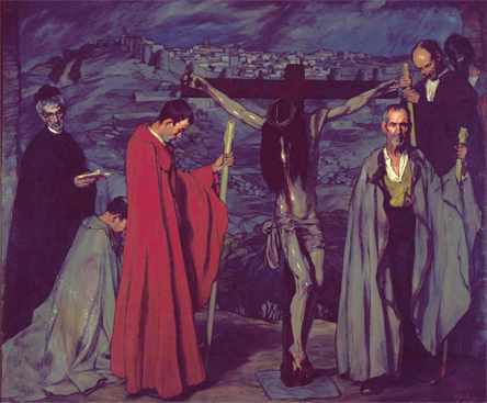 對于畫家來說,對于看到這幅畫的外國人來說,這就是西班牙的土地和屬于這片土地的人。丹納曾在他的《藝術(shù)哲學(xué)》中寫道:“西班牙畫家給你們看到的是他們的種族的典型,又是瘦削,又是神經(jīng)質(zhì),結(jié)實(shí)的肌肉受著山上的北風(fēng)吹打和太陽的熏炙格外堅(jiān)硬,性情頑固、倔強(qiáng),壓制的情欲老是在沸騰,內(nèi)心的火燒得滾熱,憂郁,嚴(yán)酷,受著煎熬;深色的衣服和畫面上焦黑的色調(diào)對比強(qiáng)烈。”《血基督》展現(xiàn)的正是這樣的人物形象。陪伴受難基督的這幾個西班牙人,不是有名有姓的人,而是民族的群像,也就是說,他們是“類型”,是畫家從他對本國民眾的觀察中提取出的藝術(shù)形象,是風(fēng)格化了的西班牙人。他們與他們身后的原野與城市共同構(gòu)成西班牙的風(fēng)景。這陰郁、悲愴、具有濃厚中世紀(jì)色彩的風(fēng)景,也是同時代的西班牙詩人與散文作家所凝視、描繪和贊嘆的風(fēng)景。阿索林在一篇散文中寫道:“我看見虔敬之心在我們的西班牙所常臨的一切地方。我們的整個靈魂,我們的民族的整個堅(jiān)實(shí)的心靈,不就是在那些教堂中,在那些基督受難十字架中,在那些苦修庵中,在那些修道院中,在那干燥的天空中,在那平碩的平原中嗎?”如果說我們常在旅游廣告中所見的地中海景致的西班牙是一個表層的、膚淺的西班牙的話,那么這個內(nèi)陸的、山野的西班牙則是深沉的西班牙。