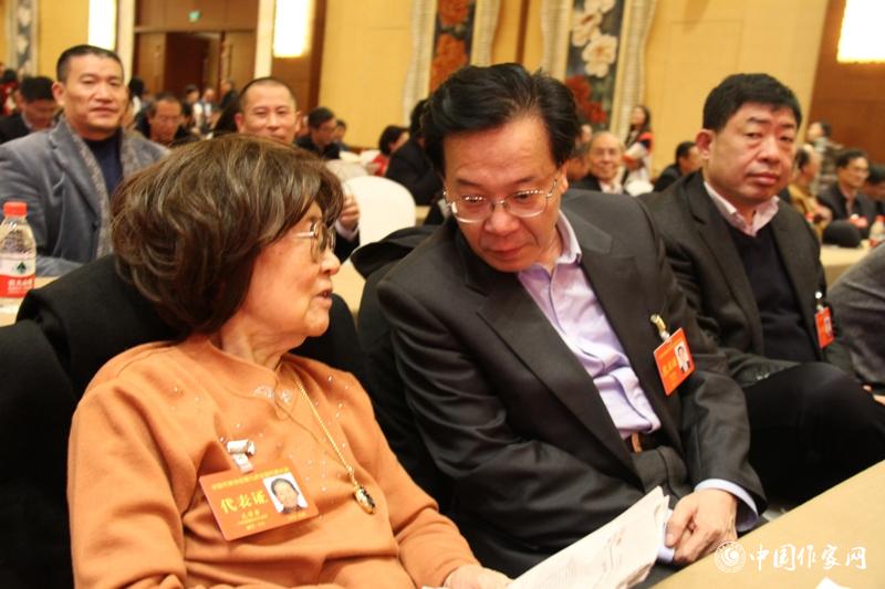 12月2日下午,文潔若、李福明等代表在報(bào)告會(huì)前交談。