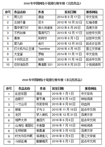 附:2016年中國網(wǎng)絡(luò)小說排行榜年榜(已完結(jié)作品)評語