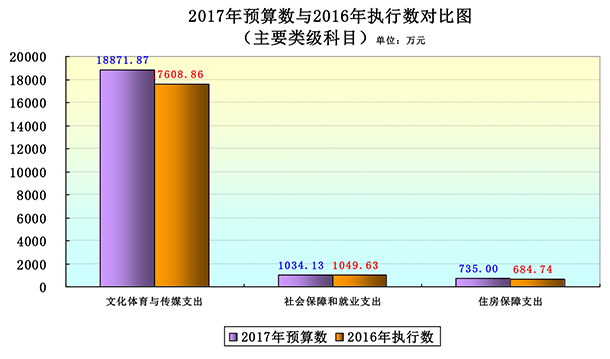 (一)文化體育與傳媒支出(類)2017年年初預(yù)算數(shù)18871.87萬(wàn)元,比2016年執(zhí)行數(shù)增加1263.01萬(wàn)元,增幅7.17%。其中: