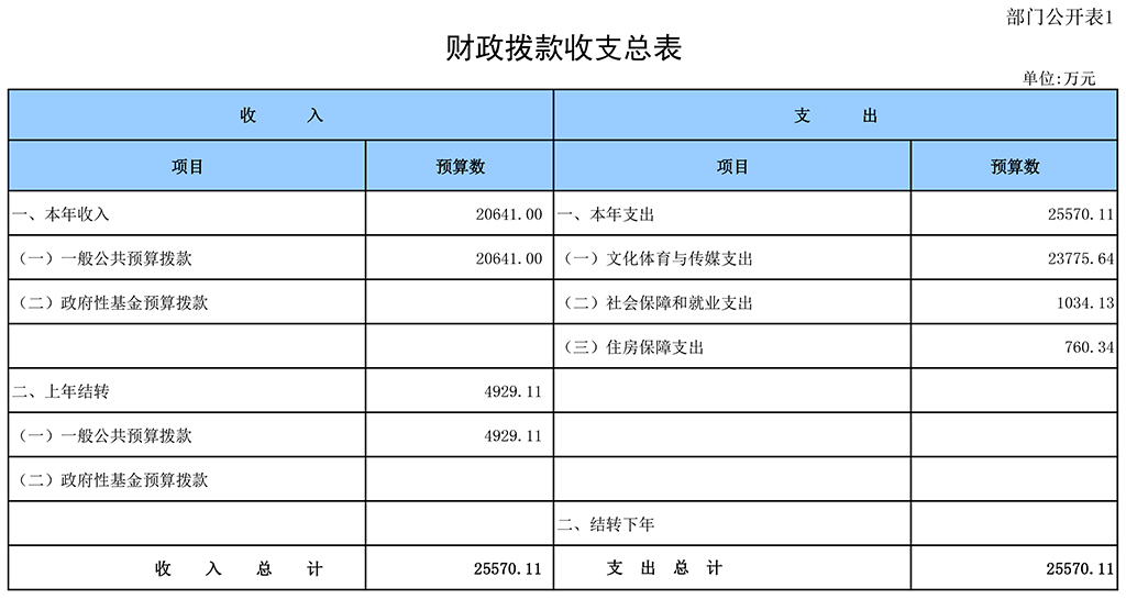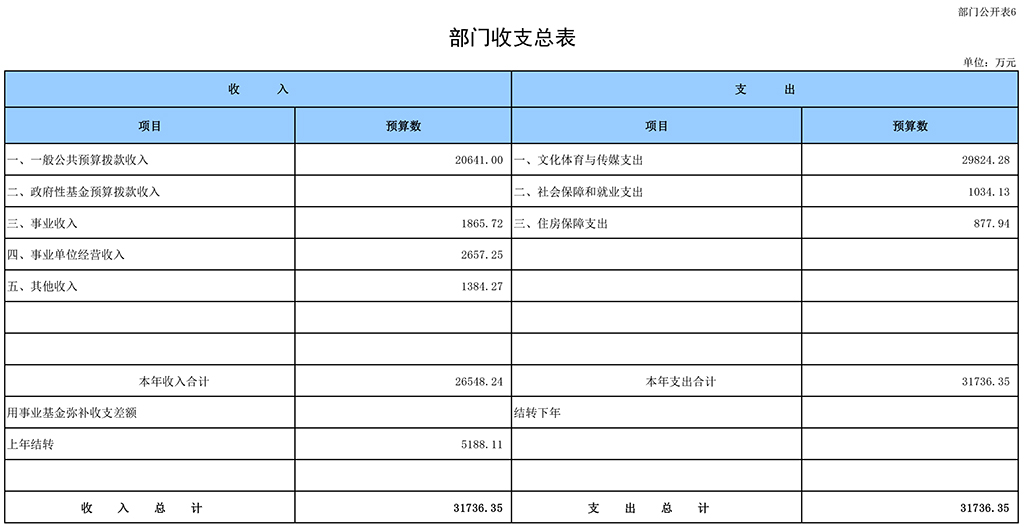 收入包括:一般公共預(yù)算撥款20641萬(wàn)元,上年結(jié)轉(zhuǎn) 4929.11萬(wàn)元。支出包括:文化體育與傳媒支出23775.64萬(wàn)元,社會(huì)保障和就業(yè)支出1034.13萬(wàn)元,住房保障支出760.34萬(wàn)元。
