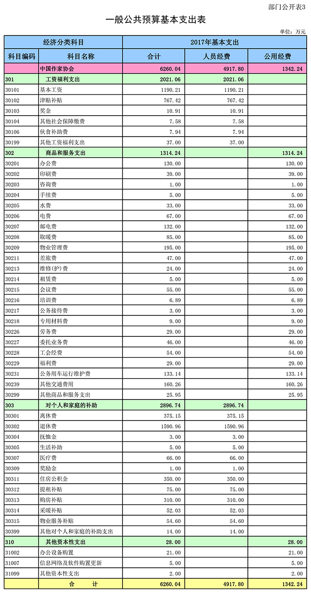 中國(guó)作家協(xié)會(huì)2017年一般公共預(yù)算基本支出6260.04萬(wàn)元,其中: