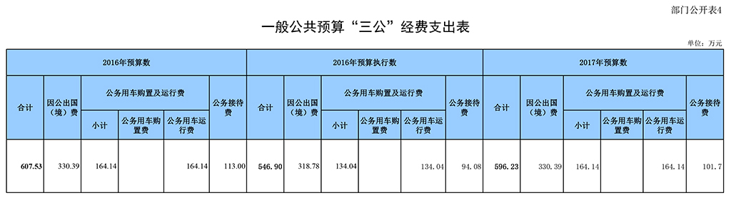 2017年“三公”經(jīng)費(fèi)財(cái)政撥款預(yù)算596.23萬(wàn)元,比2016年預(yù)算數(shù)減少11.3萬(wàn)元,主要是中央財(cái)政對(duì)2017年公務(wù)接待費(fèi)支出進(jìn)行了統(tǒng)一壓減。其中:因公出國(guó)(境)費(fèi)330.39萬(wàn)元,與2016年預(yù)算數(shù)相同;公務(wù)用車(chē)購(gòu)置及運(yùn)行費(fèi)164.14萬(wàn)元,與2016年預(yù)算數(shù)相同;公務(wù)接待費(fèi)101.7萬(wàn)元,比2016年預(yù)算數(shù)減少11.3萬(wàn)元。