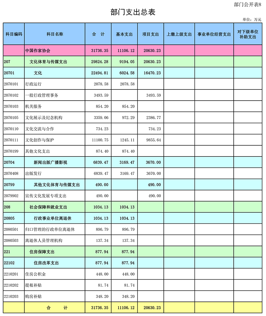 七、文化體育與傳媒(類)文化(款)行政運(yùn)行(項(xiàng)):指中國(guó)作協(xié)本級(jí)行政人員工資及機(jī)構(gòu)正常運(yùn)轉(zhuǎn)、履行職責(zé)所需的基本支出。