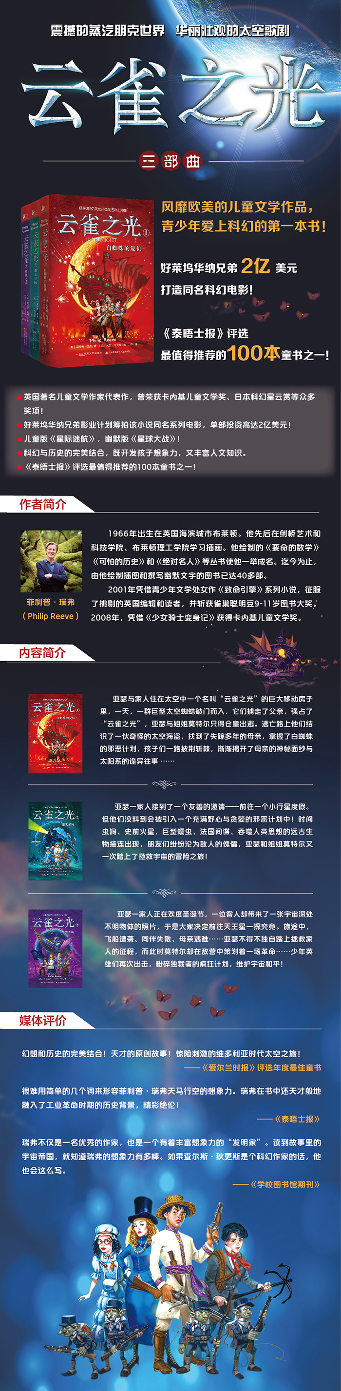 好萊塢2億美元打造同名科幻電影!《泰晤士報(bào)》評(píng)選值得推薦的100本童書(shū)之一。真實(shí)的歷史背景,震撼的蒸汽朋克世界,華麗壯觀的太空歌劇!青少年愛(ài)上科幻的書(shū)!