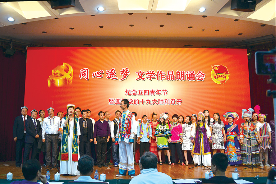 5月5日,北京的天空呈現(xiàn)出初夏的明媚,恰如青春,恰如文學(xué),無論任何時(shí)候,都有無法遮擋的光華。這天下午,為紀(jì)念五四青年節(jié)和迎接黨的十九大勝利召開,由中國(guó)作協(xié)機(jī)關(guān)黨委主辦、中國(guó)作家出版集團(tuán)黨委協(xié)辦的“同心逐夢(mèng)”文學(xué)作品朗誦會(huì)在中國(guó)現(xiàn)代文學(xué)館舉行。中國(guó)作協(xié)副主席吉狄馬加代表中國(guó)作協(xié)向青年朋友表示節(jié)日的祝賀。來自中國(guó)作協(xié)各部門各單位的青年人會(huì)聚一堂,朗誦他們心中動(dòng)人的文學(xué)篇章。平日里,他們是文學(xué)編輯,是文學(xué)工作者,把青春和才華化為沉默而堅(jiān)實(shí)的力量;今天,他們站在聚光燈下,以最真摯的聲音表達(dá)對(duì)文學(xué)經(jīng)典的深情回望,對(duì)文學(xué)夢(mèng)想的不懈追求。
