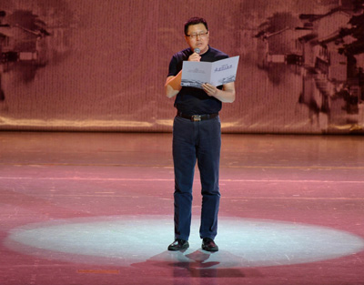 在昨晚的誦讀會(huì)現(xiàn)場(chǎng),桐鄉(xiāng)市作家協(xié)會(huì)主席陳偉宏正在誦讀自己的原創(chuàng)詩(shī)歌。