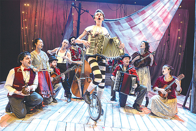 劇本改編和導(dǎo)演是曾獲英國戲劇最高獎(jiǎng)項(xiàng)奧利弗獎(jiǎng)提名的薩莉·庫克森,她曾在國家劇院執(zhí)導(dǎo)過《簡·愛》。腳本改編線條簡潔,且忠實(shí)地建立在電影原作的基本框架上,舞臺(tái)演出卻誕生于排練室的一次次即興激烈爭辯與創(chuàng)作者們的不斷摸索、探討,最終以一種精巧而整體、動(dòng)態(tài)的戲劇模式呈現(xiàn),舞臺(tái)空間精簡而功能多樣,兩根電線桿兼作馬戲團(tuán)的演出立柱和宿營帳篷桿。由作曲家本吉·鮑爾提供的現(xiàn)場音樂和原創(chuàng)歌曲成為整個(gè)演出的重心,現(xiàn)場演奏的手風(fēng)琴、吉它、小提琴、兩把低音提琴和兩把大提琴,再加上劇中人、戲中戲不時(shí)的起舞、雜耍、打鼓、吹喇叭,煞是熱鬧好看而動(dòng)人心懷,音樂曲風(fēng)現(xiàn)代而多元,激烈而婉轉(zhuǎn),其中大海和酒吧的音樂主題頗富感染力。