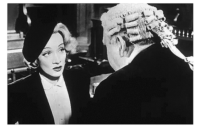 《控方證人》的結(jié)局,可以說(shuō)“非?,斄铡斓蔓悺?,但是“不怎么比利·懷爾德”。片中弗蘭倫夫人設(shè)定是56歲,演員實(shí)際年齡59歲。而看上去人近中年、仍然風(fēng)姿綽約的黛德麗,時(shí)年正是56歲。如果對(duì)她不了解,在黑白光影的曖昧掩飾下,只看片中的形象很難有人想到她已經(jīng)如此高齡。從《日落大道》到《麗人劫》,懷爾德一貫對(duì)年長(zhǎng)如斯的女人苛刻之至,她們總是扭曲而可怖的,更不要說(shuō)表達(dá)某種敬佩之意了,從這一點(diǎn)看克里斯汀·沃爾的確是一個(gè)“不同凡響的女人”。