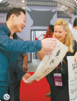②第十二屆北京文博會上,一名斯洛文尼亞觀眾被中國書法吸引。光明圖片/視覺中國