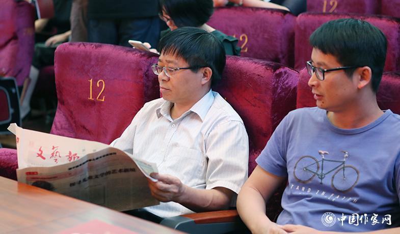 參加頒獎典禮的學生排隊入場,工作人員為他們分發(fā)當天的《文藝報》兒獎特刊