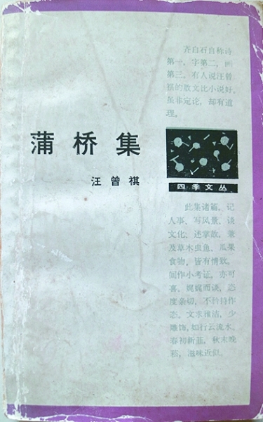 他曾對漓江出版社的《汪曾祺自選集》(1987年10月出版)發(fā)表過一通很妙的議論。他剛拿到此書時,對送書上門的聶震寧說:“藍配紫,臭狗屎?!保ù藭饷娴仙?,而書名中“自選集”三個大字卻是綠藍色的)。聶震寧回說:“臭狗屎就臭狗屎,反正書是好書?!边@本書初版本才印了兩千冊,汪先生怕出版社虧本,給家鄉(xiāng)高郵的官員寫信,看家鄉(xiāng)新華書店可否能訂一點,以解出版社之憂。僅此小事,也可見出汪先生的善良和善解人意,許多時候,他總是為別人著想的。我手頭的這本“自選集”,就是購于高郵縣新華書店,時間是1988年10月。