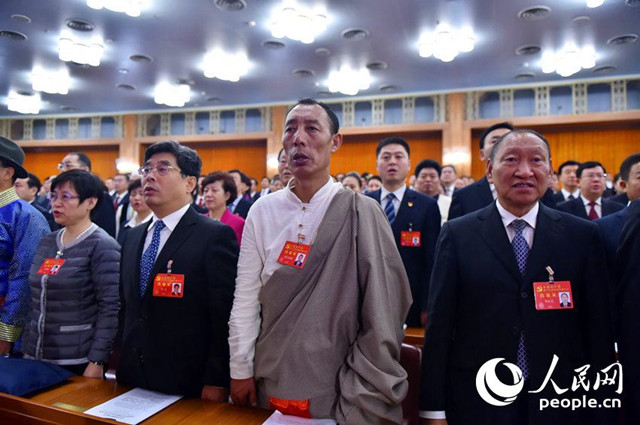 中國共產黨第十九次全國代表大會開幕會現(xiàn)場,代表起立唱國歌。(人民網記者 翁奇羽 攝)