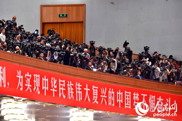 中國共產黨第十九次全國代表大會開幕會現(xiàn)場,中外記者齊聚采訪。(人民網記者 翁奇羽 攝)