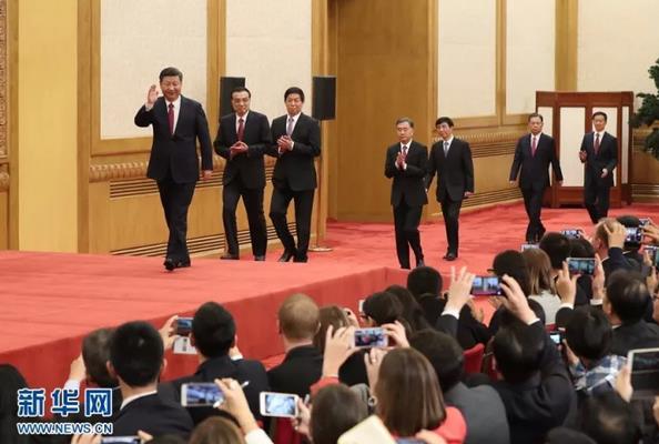 10月25日,黨的十九屆中央委員會(huì)第一次全體會(huì)議新選出的中央政治局常委同中外記者見(jiàn)面。圖片來(lái)源:新華社