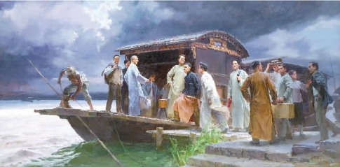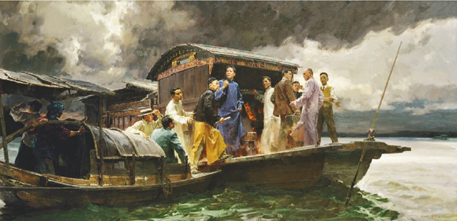 在我心中兩張稿子都是難以割舍的。在整個構(gòu)思的過程中,我反復(fù)查閱了大量有關(guān)一大的資料,其中一大代表的生平深深地觸動了自己,深感一大代表身上都流淌著要改變舊中國的一腔熱血。他們當(dāng)時是一群年輕的、自覺的、渴望肩負(fù)國家及民族命運(yùn)的知識分子,暫且不說其中某些人的歷史命運(yùn)發(fā)生了何種變化,我的內(nèi)心很希望能將參加南湖會議的全部代表都在畫中有所表現(xiàn)。所以,我在畫稿中盡量想安排好每個代表出場位置。根據(jù)李達(dá)夫人王會悟的回憶,南湖紅船并不能直接??繜熡陿乔暗拇a頭,而是停在湖中,由一只小船(稱拖捎船)往來于碼頭與大船之間接送客人。如果表現(xiàn)這樣方式上船,很難表達(dá)出我想將一大代表全部畫進(jìn)去的初衷,于是我設(shè)想一大代表由碼頭邊的跳板上船,這樣的安排可以將一大代表較為輕松地安排在畫面中。而且這樣畫面容易體現(xiàn)出會議的莊重,然后我盡量加重畫面的色調(diào),強(qiáng)化了風(fēng)雨前的效果,將光線斷斷續(xù)續(xù)地集中在代表身上,使畫面的神秘感有所加強(qiáng),也使較多的人物在空間展開時有主次之分。這張構(gòu)圖在人物表現(xiàn)的主次關(guān)系中,側(cè)重于2002年中共黨史新編中的排序,突出了李達(dá)、李漢俊、陳潭秋和董必武的地位,青年毛澤東則緊隨其后。后來,在我的合作者黃發(fā)祥老師的協(xié)助下,歷時七個月的緊張工作,完成了這張5米長、 2 . 5米高的創(chuàng)作。作品完成后的效果基本達(dá)到了預(yù)期要求。