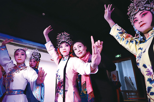 圖為國家級非物質(zhì)文化遺產(chǎn)項(xiàng)目評劇代表性傳承人袁淑梅(右二)在后臺指導(dǎo)演員