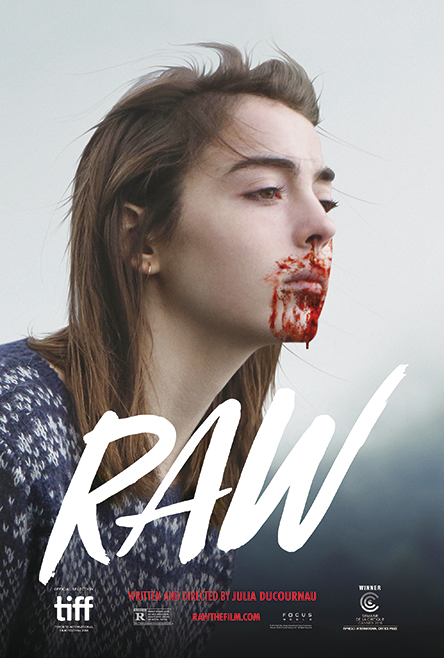 法國(guó)電影《生吃》同樣是披著恐怖片的皮囊,講述成長(zhǎng)的痛楚。與《當(dāng)怪物來(lái)敲門》不同的是,《生吃》沒有超現(xiàn)實(shí)橋段,少女生吃血肉的情節(jié)雖然夸張,也完全可以是真實(shí)的。此片的影像和它的名字一樣生猛:一個(gè)出身于素食家庭的少女,在去大學(xué)讀獸醫(yī)專業(yè)后,逐漸按捺不住對(duì)新鮮血肉的口腹之欲,更令人不安的是,同校就讀的姐姐早已遵循內(nèi)心的渴望成了食人者,還想教會(huì)妹妹如何獵食。