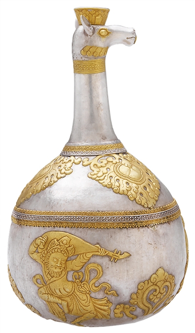 這是存放于大昭寺中的一件珍貴銀器(圖一)。體形巨大,花紋復(fù)雜,特別是瓶身雕刻的反彈琵琶形象,讓人很容易聯(lián)想起敦煌壁畫中的類似形象,但仔細觀察又有明顯不同,引起不少人的興趣。目前,它還在大昭寺中承擔(dān)存放青稞酒的“職責(zé)”,所以只能來京一個月,即將載譽回鄉(xiāng)。