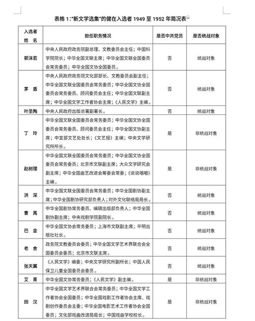 我們看看這些最終入選“新文學(xué)選集”的健在作家名單,并微觀考察其基本的政治傾向及新政權(quán)對(duì)他們的“態(tài)度”,統(tǒng)計(jì)情況如下: