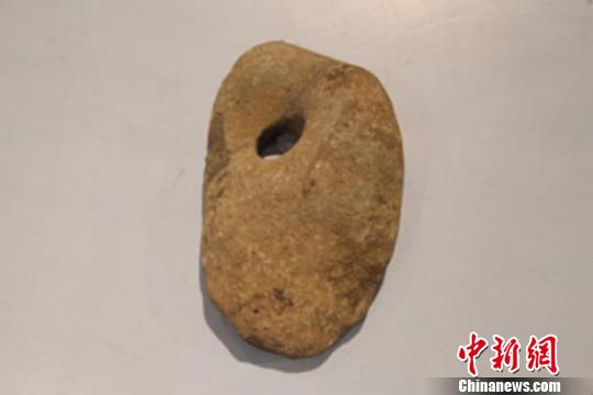 2016年,張福有與長(zhǎng)白山池南區(qū)委書記曹樹(shù)清又一次來(lái)到訥殷古城附近的石制手斧發(fā)現(xiàn)地,采集到一塊穿孔石器。他們認(rèn)為,該石器表面有磨制痕跡,應(yīng)是人工所為,不是自然形成,很有可能是古代時(shí)期的石器。