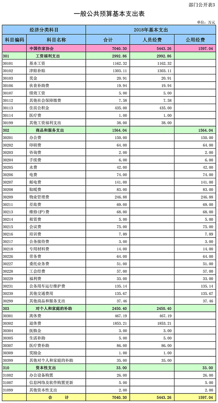 中國作家協(xié)會(huì)2018 年一般公共預(yù)算基本支出 7040.30萬元,其中: