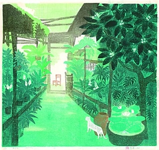 去過鄭爽家的人,都會對她草木蔥蘢的陽臺留下深刻印象。如果說《我的陽臺》是她對自己生活的如實描述,那么《后院》則更接近她理想中的家園。研究《后院》的原版會驚訝于它的簡練。鄭爽僅僅用了4塊版,就營造出了生機盎然、層次豐富的美好畫面。