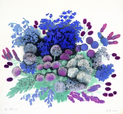 鄭爽的成名之作就是兩張花?!独C球花》這幅邊長只有36厘米的小畫在參加“第七屆全國版畫展”后被中國美協(xié)送去法國巴黎春季沙龍展,并一舉獲得金獎。緊接而來的“第六屆全國美展”中,她創(chuàng)作的《黑牡丹白牡丹》獲得銀獎,她帶領(lǐng)青年教師完成的組畫《華夏之歌》也同時獲得銀獎。這一年鄭爽48歲,展示出一個中年藝術(shù)家噴涌而出的創(chuàng)作熱情。