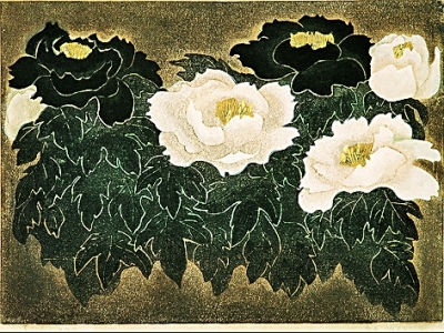 今天,我們熟悉的鄭爽版畫面貌大致可歸納為:作品不是單純對自然形態(tài)的摹仿,而是經(jīng)過概括提煉,巧妙地分版套色,蒼潤兼濟的水分控制,以及對紙張肌理、木板紋路的細微感受,做足內(nèi)在功夫又蘊藉內(nèi)斂,讓普通的靜物有了精神性的內(nèi)蘊和力量。她擅用黑色,莊嚴穩(wěn)重中不動聲色地烘托出其他色彩。她常用綠色、藍色等冷調(diào)顏色,少用暖色,即使有也是接近大地色系的土黃、赭石和熟褐。她在克制中展示精神性的高貴,探討趣味的雋永,在水色氤氳中大家格局盡顯。這種“鄭氏”語言大概在20世紀70年代末、80年代初逐步形成,到1981年創(chuàng)作出《繡球花》,鄭爽的版畫語言基本成形,1984年她創(chuàng)作出《黑牡丹白牡丹》,至此她的水印木刻語言進化已然完成。此后的一系列花卉作品都延續(xù)了這一風格,只是在語言精純度上繼續(xù)深化與提升罷了。