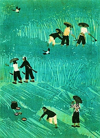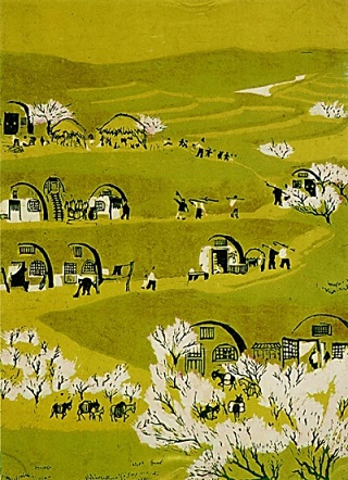 《黃土高原的春天》是鄭爽大學三年級跟隨李樺先生去三門峽工地體驗生活的創(chuàng)作。她巧妙地繞過熱火朝天的建設(shè)場景,描繪了山村農(nóng)家的溫馨生活,強調(diào)整體氣氛而不著力于文學性敘事,不以黑線結(jié)構(gòu)畫面,而是用色塊直接交融,人物在畫面中只做點綴,整體風格浪漫抒情。這幅作品在《人民日報》發(fā)表并參加了“第四屆全國版畫展”,又被印成明信片在海內(nèi)外發(fā)行。但對鄭爽來說,這幅畫更重要的意義在于創(chuàng)作中侯一民先生對她說的話:“一個人不能和他的性格愛好背道而馳,那樣你沒有感受,是不能畫好畫的?!?/p>