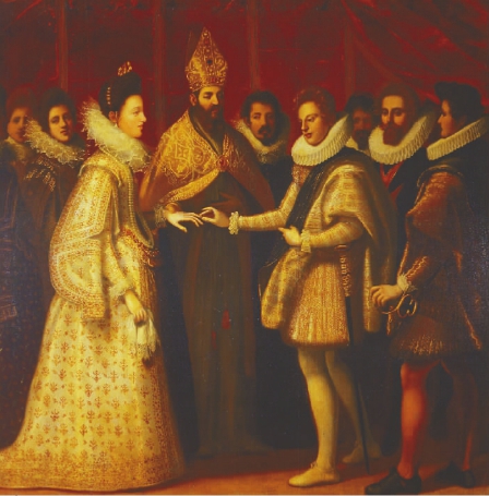 這是一幅描繪意大利婚禮的傳統(tǒng)繪畫,是美第奇家族與貢扎伽家族的首次聯(lián)姻。新郎與四名男賓立于右側(cè),新娘和她的母親以及女賓們站在左側(cè)。據(jù)記載1584年文琴佐·貢扎伽率大量隨從來佛羅倫薩舉行婚禮,教皇格里高利十二世派主教德拉·科爾格納主持婚禮儀式。
