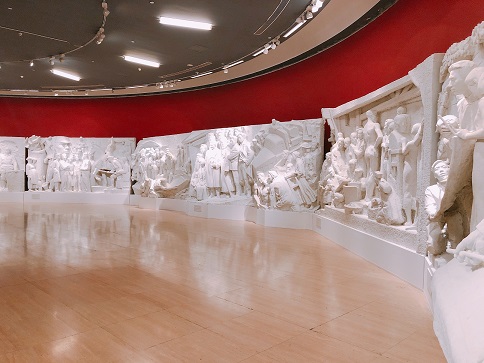 六件高2.55米、總長45米的“烽火藝程”主題浮雕所刻畫的正是國立藝專師生們譜就的西遷歷史圖景。刀石鑿撞的力度所營造的紀念碑式的宏大與厚重,才足以匹配這段腹地長征的波瀾壯闊。