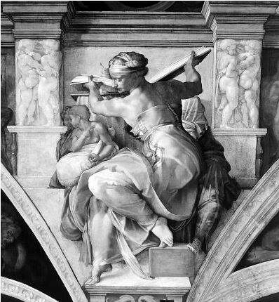 米開朗基羅為梵蒂岡西斯廷教堂所繪天頂畫的一部分《女預(yù)言家利比亞》。