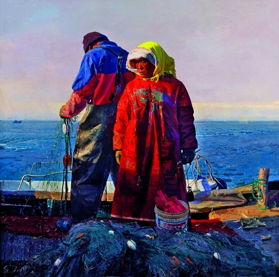 青年畫家田野創(chuàng)作的工筆重彩《中國紅》,表現(xiàn)了工人懸掛在高空中進(jìn)行粉刷作業(yè)的場景,揮舞的刷子左右搖擺,游刃有余,顯示出勞動(dòng)者嫻熟的技術(shù)。主體人物濃重的黑色配合背景的礦物朱砂色,強(qiáng)烈的黑白紅對(duì)比關(guān)系給人以震撼的視覺效果。田野說,當(dāng)時(shí)他看到粉刷建筑外墻的工人,身上的衣服被飛濺的油漆染成畫面般的效果,工人們認(rèn)真的勞動(dòng)精神打動(dòng)了他,勾起了其強(qiáng)烈的創(chuàng)作激情,他通過速寫、草圖、圖片等綜合方式收集了大量素材,最終創(chuàng)作出了這樣一幅具有時(shí)代特色的重彩作品,體現(xiàn)了新時(shí)代勞動(dòng)人民的生產(chǎn)熱情。王海濱、王瑛合作繪制的工筆畫《桑葚》,表現(xiàn)的是維吾爾族婦女的勞動(dòng)場面。畫家將主要人物安排在黃金分割線附近,與底部的木桌呈現(xiàn)出三角形態(tài)勢,偏仰視的角度體現(xiàn)了勞動(dòng)人民的崇高。為了突出畫面光感,畫家主動(dòng)將人物處理成厚重、深沉的逆光效果,背景運(yùn)用了濃重的蛤粉,將人物以及道具的外部輪廓完整地襯托出來。由于逆光具有平面性特點(diǎn),這進(jìn)一步提供了造型語言與中國畫平面性審美特征的視覺因素,強(qiáng)烈的明暗對(duì)比既體現(xiàn)了新疆地區(qū)的光照特征,同時(shí)又象征了勞動(dòng)人民光明美好的內(nèi)心世界。趙健創(chuàng)作的油畫作品《故鄉(xiāng)》則使用了“紀(jì)念碑式”經(jīng)典構(gòu)圖,畫面主體是一對(duì)勞動(dòng)中的漁民,夫妻相背而立,猶如“英雄”一般佇立在漁船上,畫家通過藝術(shù)加工賦予了作品含蓄的詩性。