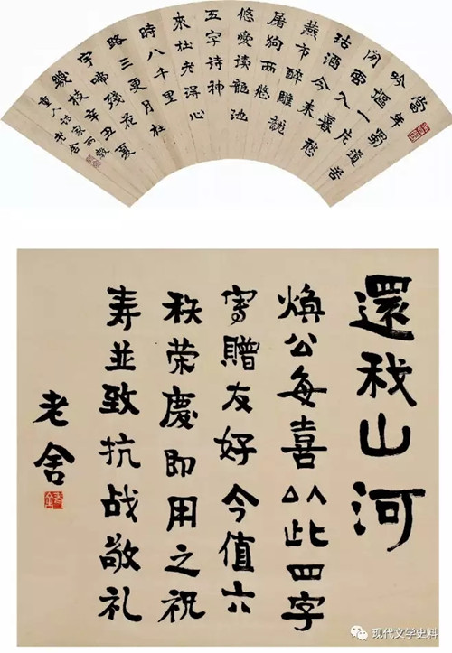 其三,雅致。書法基本是高雅文化,對文人雅士而言,其書寫行為本身就透露著雅致的人文氣質(zhì),是他們骨子里的東西。作為“人民藝術(shù)家”的老舍,崇尚雅俗共賞、由俗向雅。其書法手稿自然而然透露著他的這種雅致的文人氣質(zhì)。 老舍文學(xué)創(chuàng)作手稿作為存世的復(fù)合文本,堪稱高雅文化的瑰寶,原本是其“文學(xué)生產(chǎn)”過程中的最初成品,只是提供給編輯審看的文稿,并不直接進(jìn)入傳播渠道。而他那些存世的書法對聯(lián)、扇面,有意識(shí)創(chuàng)作的橫幅、條幅書作,還有因雅興因情感而為的詩稿、書信,基本都是沉穩(wěn)的楷書形式,雅意盎然。其中,他常用自作詩詞的書法作品饋贈(zèng)友人,尤其是他和身為畫家的夫人胡絜青合作的書畫作品,更為友人所珍視。這類適用于文人雅士交往的書畫作品,既體現(xiàn)了對傳統(tǒng)高雅文化的繼承,也顯現(xiàn)了現(xiàn)代文人的情趣和志向。就老舍書法而言,確實(shí)功底頗深,多體雜糅,古拙質(zhì)樸,別具風(fēng)貌,其筆法明顯帶有北碑意趣,線條堅(jiān)韌凝重,結(jié)構(gòu)內(nèi)斂緊湊, 用筆張弛有度,且時(shí)或兼容漢隸及金農(nóng)漆書筆意,墨象高雅,氣質(zhì)不俗,能夠給人留下深切而又鮮明的印象。