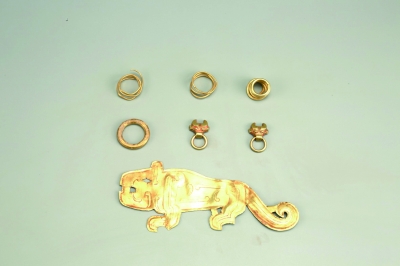 自2017年4月開始,考古隊通過“探方式”的發(fā)掘方法對墓地進行了搶救性發(fā)掘。截至目前,完成了19座中小型墓葬的清理工作,其中4座遭到盜擾,15座保存完好;共出土銅、金、鐵、石、玉、陶、料珠、漆木等各類材質文物300余件(組),其中的青銅器主要包括青銅禮器、車馬器、兵器三大類,禮器包括食器的鼎、簋、甗,水器的盤、匜及酒器的方壺,車馬器數(shù)量最多,共50余件(組),包括常見的馬銜、鑣、鑾鈴、車衡飾、車轄、軎;兵器有戈、矛、甲胄、鏃等。除此之外,還出土了喪葬用器的銅翣,及由銅魚、銅鈴、陶珠(石貝)組成的棺飾件。更讓人稱奇的是,在其中兩座小墓中,考古人員還發(fā)現(xiàn)了3件金耳環(huán)。