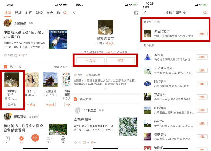 (1)在app發(fā)現(xiàn)頁熱門主題欄找到【你我的文學(xué)】主題關(guān)注。(如圖一)