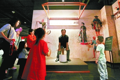 參觀者在體驗(yàn)老天橋游戲——拔燈。本報(bào)記者 方非攝