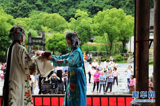 5月19日是第八個(gè)中國(guó)旅游日,江西省旅發(fā)委統(tǒng)籌了主題為“全域旅游,美好生活”的旅游活動(dòng)。婺源縣江灣景區(qū)設(shè)立的上饒分會(huì)場(chǎng)將兩大非物質(zhì)文化遺產(chǎn)徽劇和儺舞搬上了古戲臺(tái)供游人欣賞。
