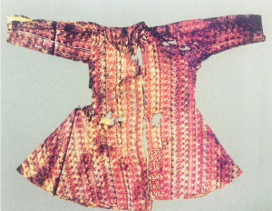 1959年,民豐縣尼雅夫妻合葬墓出土了東漢時(shí)期“萬世如意”漢字銘文錦袍。這件保存較為完好的錦袍,出土?xí)r色彩十分鮮艷。袍服身長122.5厘米,款式為“胡服”:直領(lǐng)、對襟、窄袖、緊腰、寬踞,其側(cè)加縫一塊三角衣料,增加了下擺的寬度。袍的領(lǐng)襟和下擺用繡有“延年益壽大宜子孫”的銘文錦制作。錦袍質(zhì)地厚實(shí),以絳紫色為底,配有淡蘭、油綠、白色的茱萸紋和飄逸的云紋。