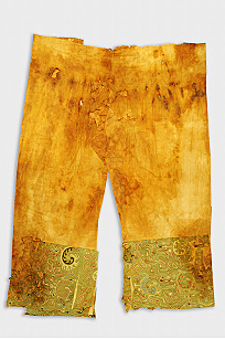 從出土的實(shí)物來看,當(dāng)時(shí)精絕人的褲裝可分為筒褲和燈籠褲兩種形制。1959年,尼雅古墓出土一件東漢時(shí)期的男夾褲,用粗棉布作面,寬腰大襠,褲腿口與山普拉古墓出土的燈籠褲相比,顯得比較寬大。褲腿用草綠色細(xì)絹鑲綴,以綠地動(dòng)物花草葉紋為主繡,草綠色細(xì)絹為底,配以絳紫、黃、寶藍(lán)、白等各色絲線,運(yùn)用鎖繡法繡出卷草葉、豆英、金鐘華等紋樣,紋飾的枝蔓循環(huán)繁復(fù),表現(xiàn)出漢代高超的織造工藝,同時(shí)顯示出漢代織錦“錦繡并用”的特征。
