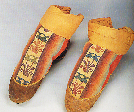 靴子是西域居民的傳統(tǒng)衣式。1995年,尼雅1號墓地3號墓出土的一雙紅底暈裥緙花靴的樣式十分獨(dú)特。靴子長29厘米,高16.5厘米,用皮、絹、氈等多種材料縫制,靴面中央的白底上織并蒂花卉圖案,起到了錦上添花的裝飾效果。靴子構(gòu)思巧妙,形制新穎獨(dú)特,是新疆古代鞋靴中的精品。