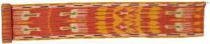 艾德萊斯綢收集于新疆庫(kù)爾勒地區(qū),大面積的紅色之中,點(diǎn)綴著象征維吾爾族生存環(huán)境的黃色,以及伊斯蘭教崇尚的綠色和象征著天空的藍(lán)色。木梳紋、石榴紋、龕座紋等紋樣呈條狀規(guī)則排列,多種色彩拼合出強(qiáng)烈的視覺(jué)效果,洋溢著跳蕩激昂的韻律和熱情似火的西域風(fēng)情。