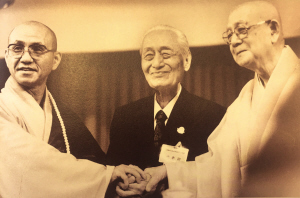 1995年5月,首屆中朝日佛教友好交流會(huì)議在北京舉辦。圖為中國(guó)代表團(tuán)團(tuán)長(zhǎng)趙樸初居士(中)與韓國(guó)代表團(tuán)團(tuán)長(zhǎng)宋月珠長(zhǎng)老(右)、日本代表團(tuán)名譽(yù)團(tuán)長(zhǎng)中村康隆長(zhǎng)老(左)握手。