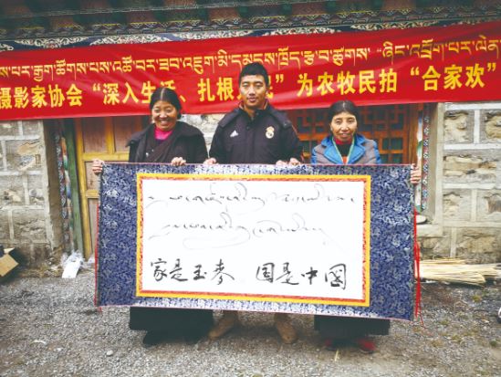 我們采風團的藝術家們這次來是有任務的:攝影家現(xiàn)場給村民們拍攝打印全家福,書法家給村民們寫“?!弊趾蛯β?lián)。村民們聽說了,都熱情地聚攏過來,彩色打印機前一點點被推出的照片,時時引起陣陣歡笑。這時卻發(fā)現(xiàn)央宗不在,說是一早就到山上趕牦牛去了。姐姐卓嘎特別請書法家寫了一幅總書記回信上“家是玉麥、國是中國”八個字的藏漢文作品。央宗回來看到也提出想要一幅,卻已經(jīng)沒有裱好的空白宣紙了。我們答應央宗,回到拉薩就給她寫完寄過來——文藝家們也不想在這個充盈著幸福氛圍的地方留下任何遺憾。