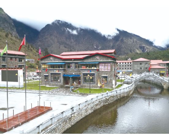 這里完全不像邊境鄉(xiāng)鎮(zhèn)的樣子!這是最初沖擊我的觀感。一條干凈的高標準水泥路沿著河谷直插下游,一幢幢風格統(tǒng)一的門巴族特色小樓齊布在路邊,每一幢樓上都裝飾著一個藏族傳統(tǒng)的吉祥八寶圖案。樓和樓都是相似的布局,一層是農(nóng)家樂的餐館布局,二層是住宿區(qū)。據(jù)說,旅游已經(jīng)成了這個邊境鄉(xiāng)鎮(zhèn)的主要收入來源之一,而我們來之前的五一假期,這里的房間供不應求。